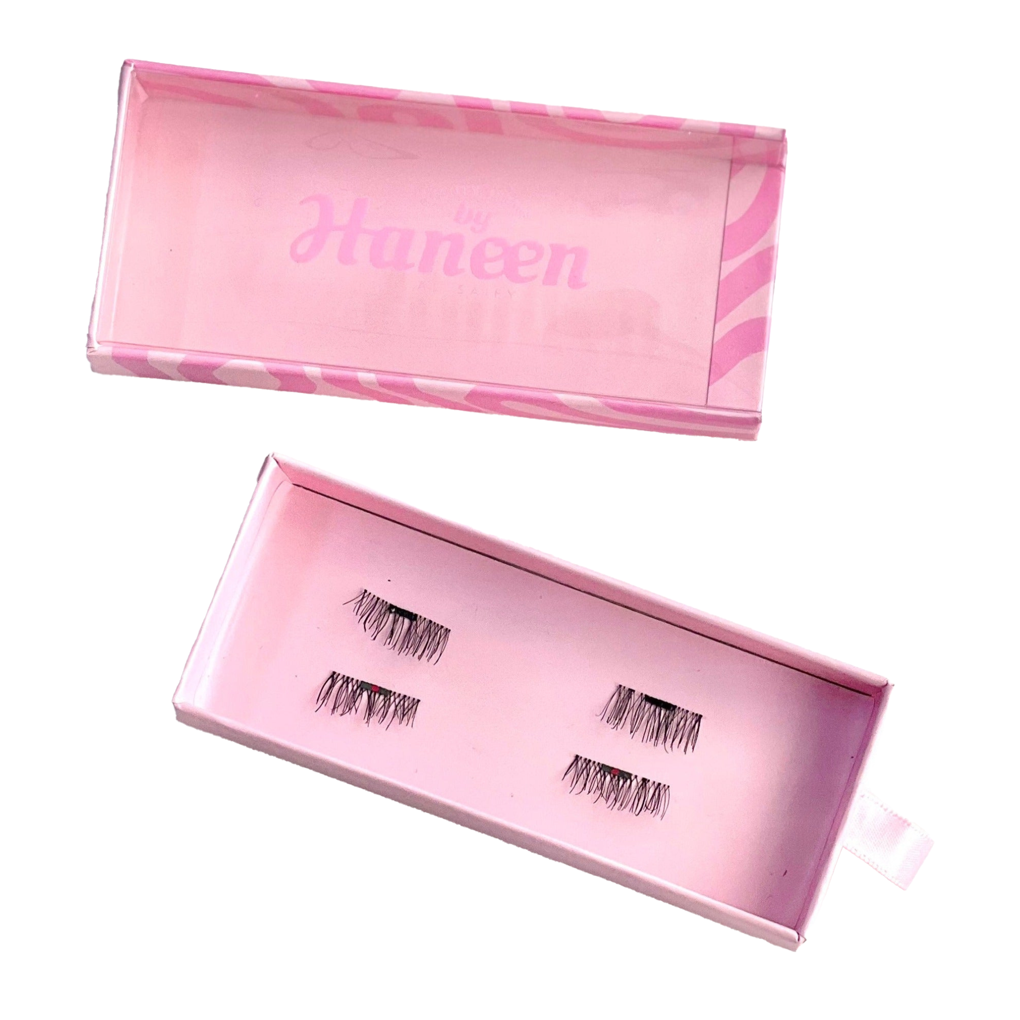 A set of 2 pairs of easy-to-wear silk lashes with no glues or adhesives required. The one with red dot is for the bottom of the lash.