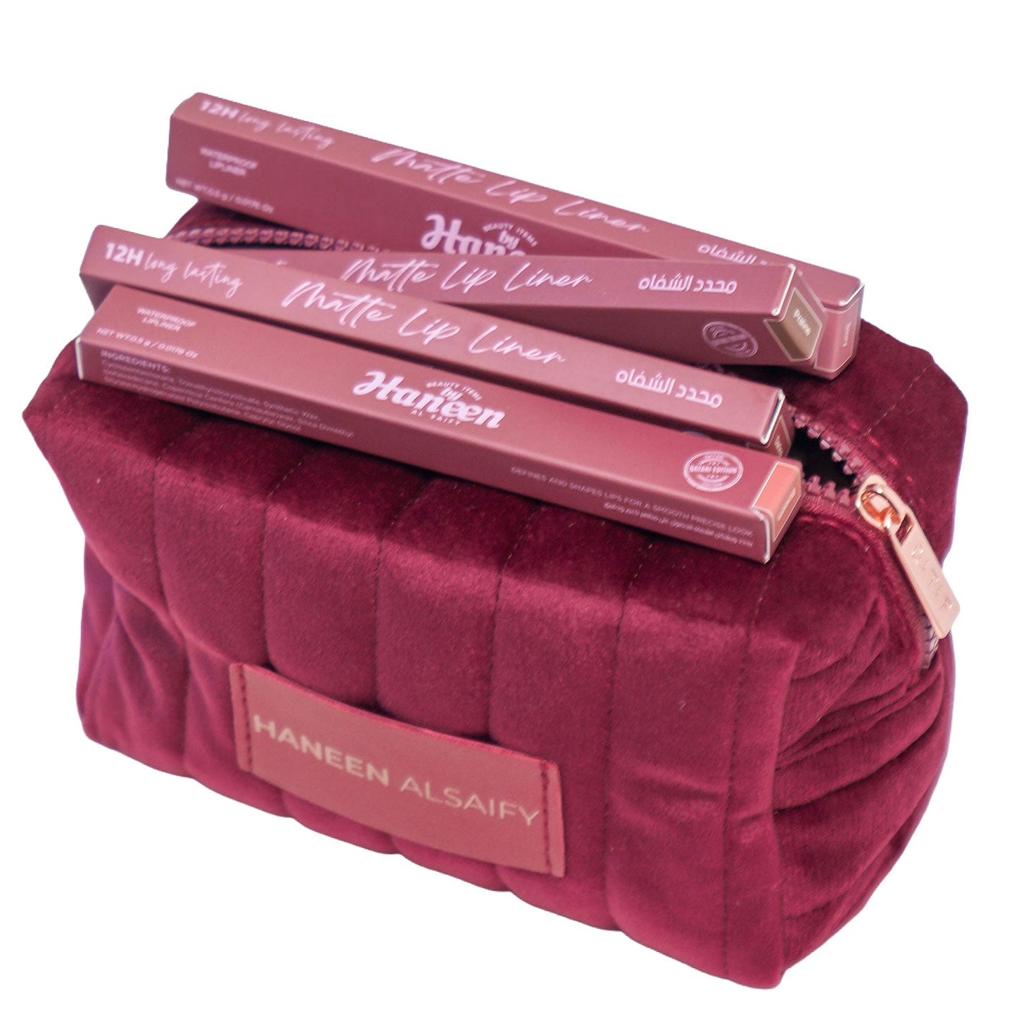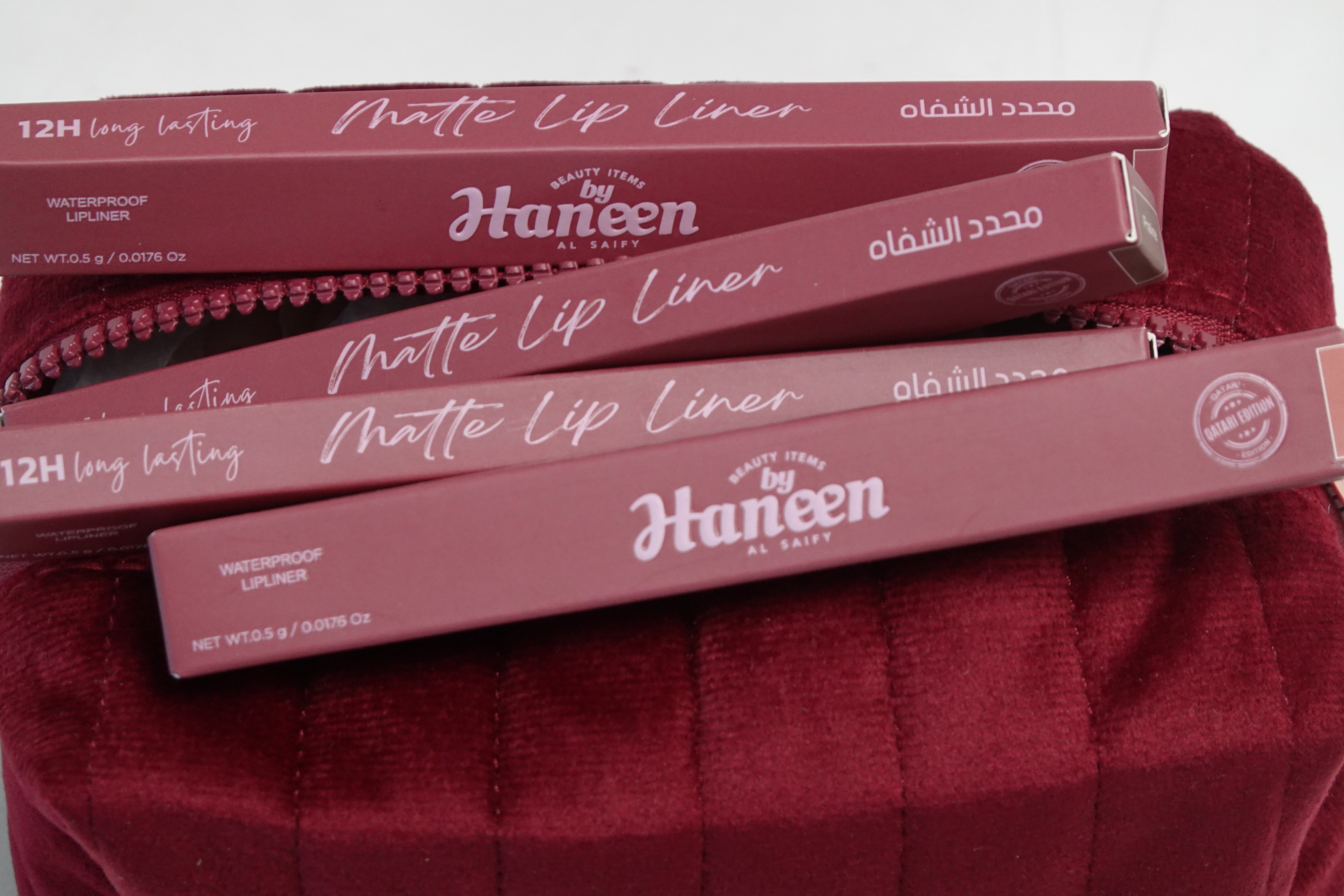 The QND Limited-Edition Beauty Bag is a celebration of luxury crafted from soft velvet, accented with a radiant rose gold zipper pull engraved with Qatar, and finished with a signature leather-woven logo. A timeless piece designed to be cherished. The bag includes special edition lip liners packaging: